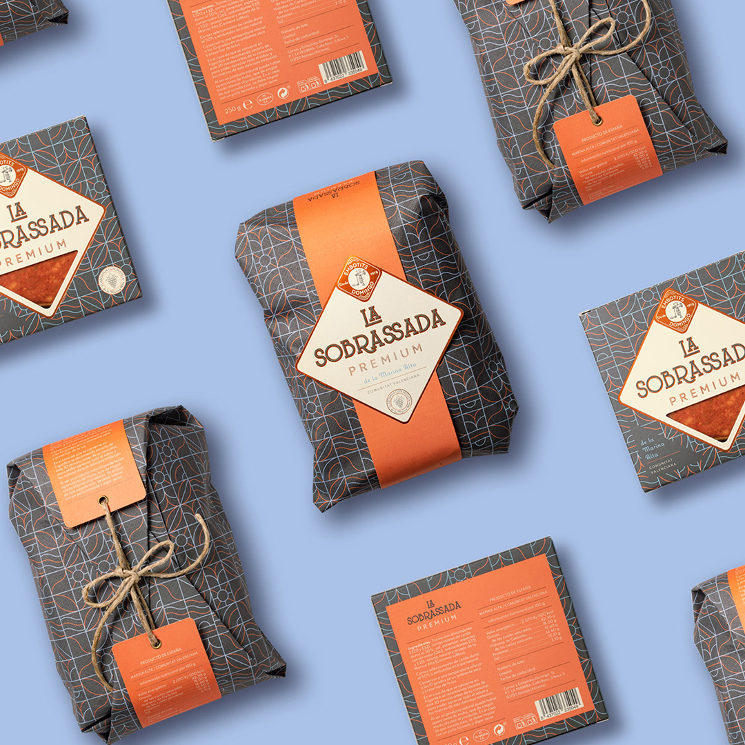包装由整件包装用优质纸和非常特殊的织物质地组成,让人联想到过去用于保存 sobrasada 的布料(Fedrigoni 的 Poliwrap Neve Carpet)。其带有线条图案的图案综合了大海、阳光和周围自然环境的性质。腰带形状的菱形标签包裹着包裹,并用绳环将其封闭(Fedrigoni 的Arena Ivory Rough)。还为 250 克的部分设计了一个带有模切窗口的盒子。